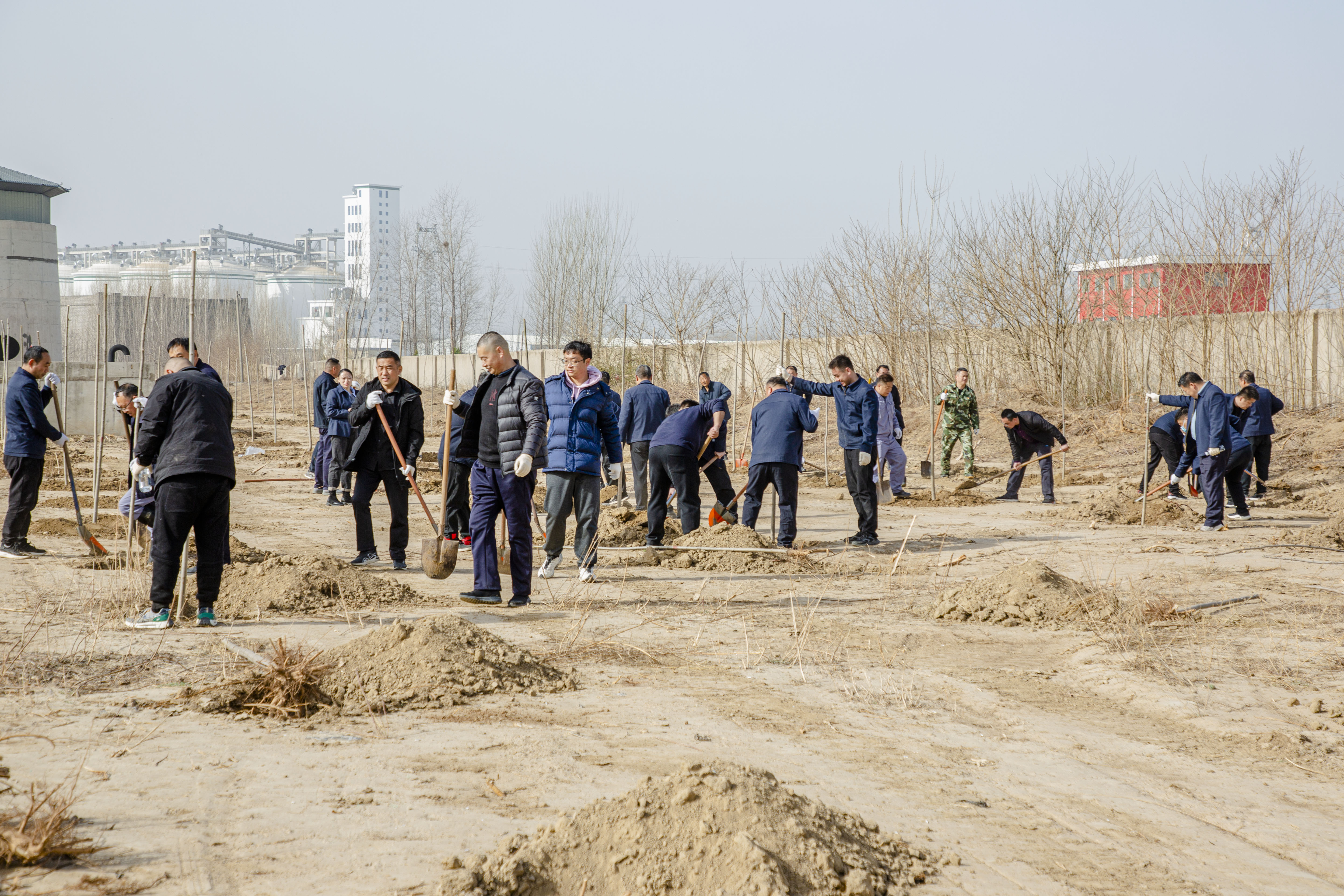 上午9時,西水坡調(diào)節(jié)池現(xiàn)場,鮮紅的黨旗迎風(fēng)招展。廣大黨員干部和職工們以黨支部為單位,兩人一組,默契配合,展開有序的“流水作業(yè)”,一人扶正樹苗,另一人揮鍬培土,隨后用腳將土層踩實(shí),最后拍成圓弧形圍堰。公司領(lǐng)導(dǎo)班子成員以身作則,全程參與,一邊培土一邊與職工親切交流。水廠黨支部率先完成任務(wù)后,轉(zhuǎn)身便跑去支援機(jī)關(guān)黨支部;龍泉公司的職工們不愧是干工程出身,最后成型的圍堰樹坑橫縱成線、弧度均勻;女職工們則細(xì)致入微,蹲身檢查每株樹苗的穩(wěn)固性,精心修正歪斜的圍堰。
