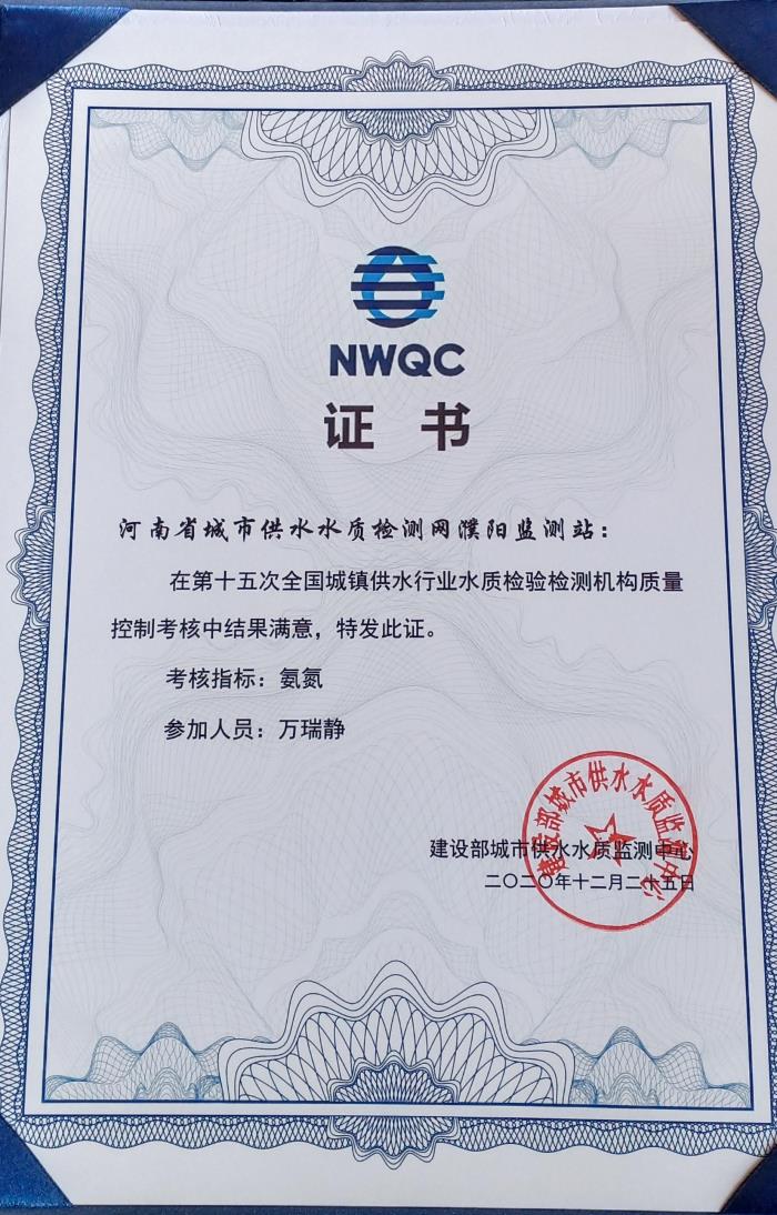 近日,由建設(shè)部城市供水水質(zhì)監(jiān)測中心組織的第15次全國城鎮(zhèn)供水行業(yè)水質(zhì)檢驗(yàn)檢測機(jī)構(gòu)質(zhì)量控制考核結(jié)果反饋,濮陽市自來水公司水質(zhì)監(jiān)測中心參加考核的“生活飲用水中氨氮”指標(biāo)2個樣品均獲滿意結(jié)果,順利通過全國質(zhì)量控制考核。