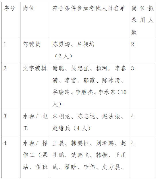 按照濮陽市自來水有限公司網(wǎng)站公示的崗位招聘條件,對應(yīng)聘人員進行了嚴(yán)格篩選,現(xiàn)將符合條件參加考試人員名單公示如下: